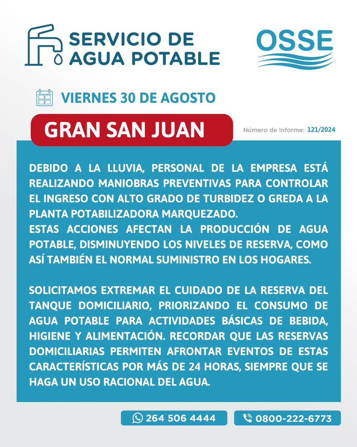 Debido a la lluvia, personal de OSSE está realizando maniobras preventivas para controlar el ingreso con alto grado de turbidez o greda a la planta potabilizadora Marquesado.