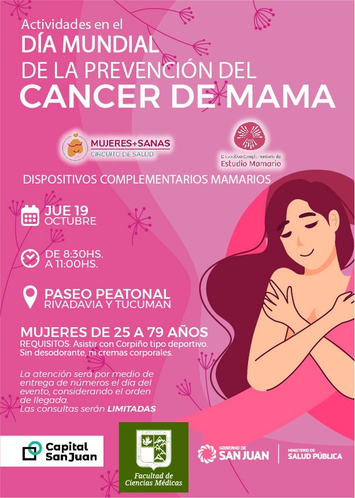 Carmen Rojo, la jefa de Perinatología y Salud de la Mujer, adelantó a sanjuan8.com que durante este jueves realizarán una jornada de prevención en el cruce de las peatonales. La actividad será libre y gratuita y apunta a realizar los estudios para detectar cáncer de mama.