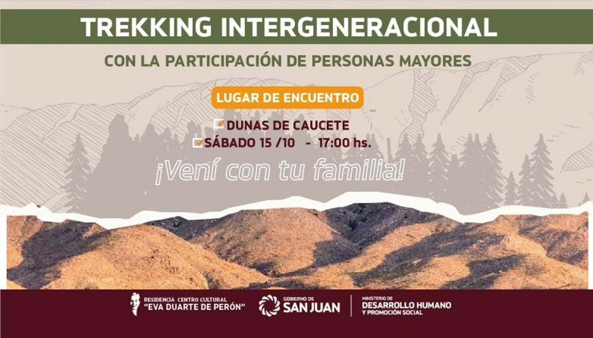 En el marco del mes por el “Día Internacional de las Personas Mayores”, la Residencia Eva Duarte de Perón dependiente del Ministerio de Desarrollo Humano y Promoción Social, organiza una jornada de trekking destinada a personas de todas las edades, con el objetivo de concientizar sobre el proceso de envejecimiento activo y saludable en las personas mayores y promover su inclusión.