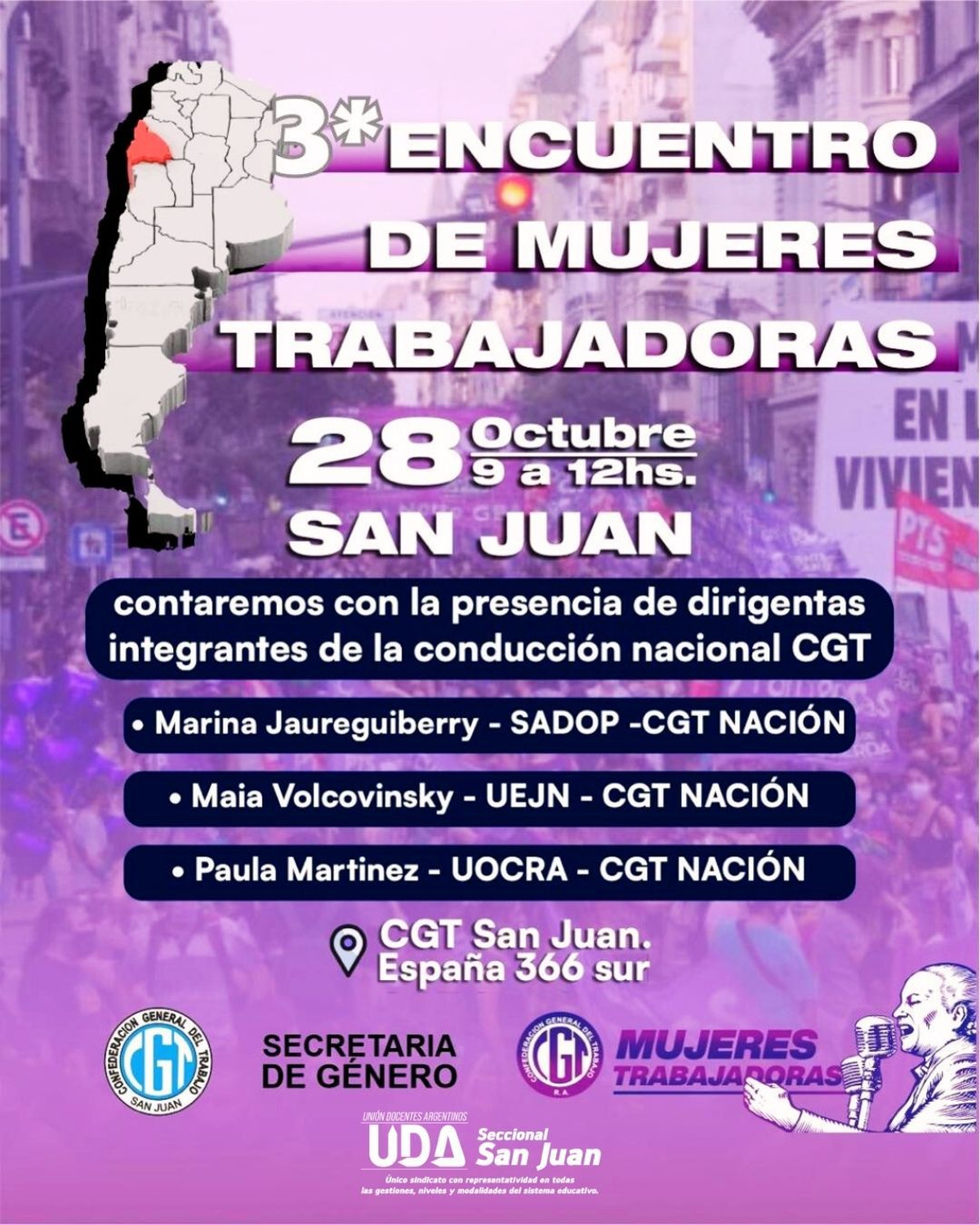 La Secretaría de Género y Mujeres Trabajadoras de la CGT San Juan realizará el 3º Encuentro de Mujeres Trabajadoras, una jornada clave para el debate, la organización y la visibilización de las problemáticas laborales y sindicales de las mujeres.
