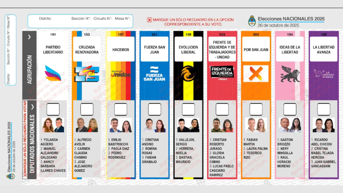 En cuanto a los resultados políticos, San Juan renovará tres bancas en la Cámara de Diputados de la Nación. El electorado sanjuanino se encontrará con 9 casilleros, correspondientes a los frentes competentes. Los lugares fueron sorteados por la organización electoral y la marca correspondiente, debe ser una cruz (x).