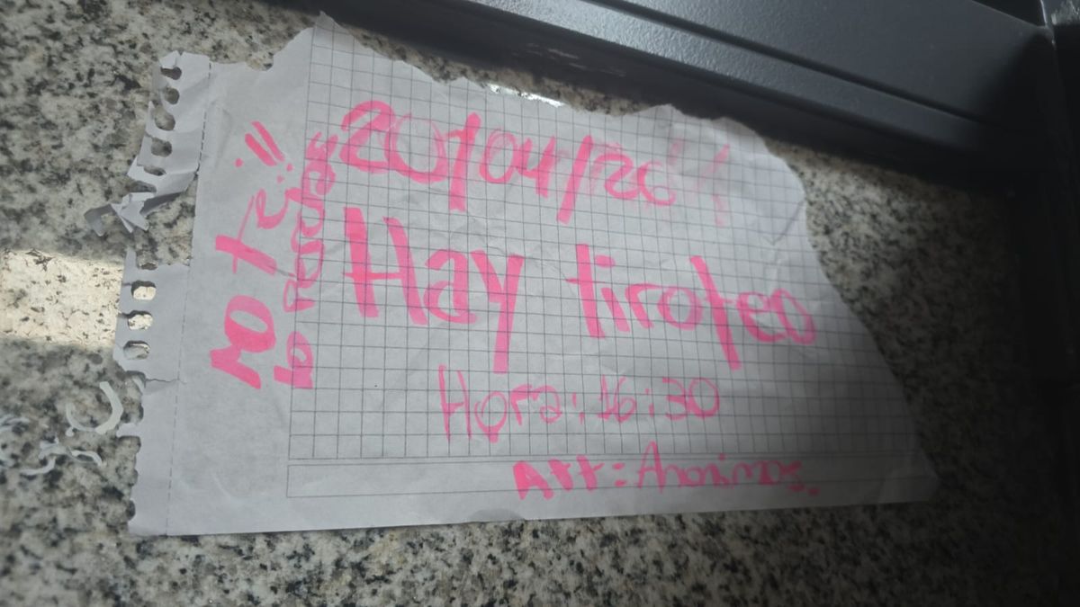 La ola de amenazas anónimas que afecta a distintos puntos del país volvió a tocar de cerca a San Juan. Este lunes 20 de abril, a primera hora, autoridades de una escuela de la localidad de Los Berros, Sarmiento, descubrieron un cartel pegado en uno de los baños con una advertencia directa: "No te pierdas, hay tiroteo hoy 16:30 horas".
