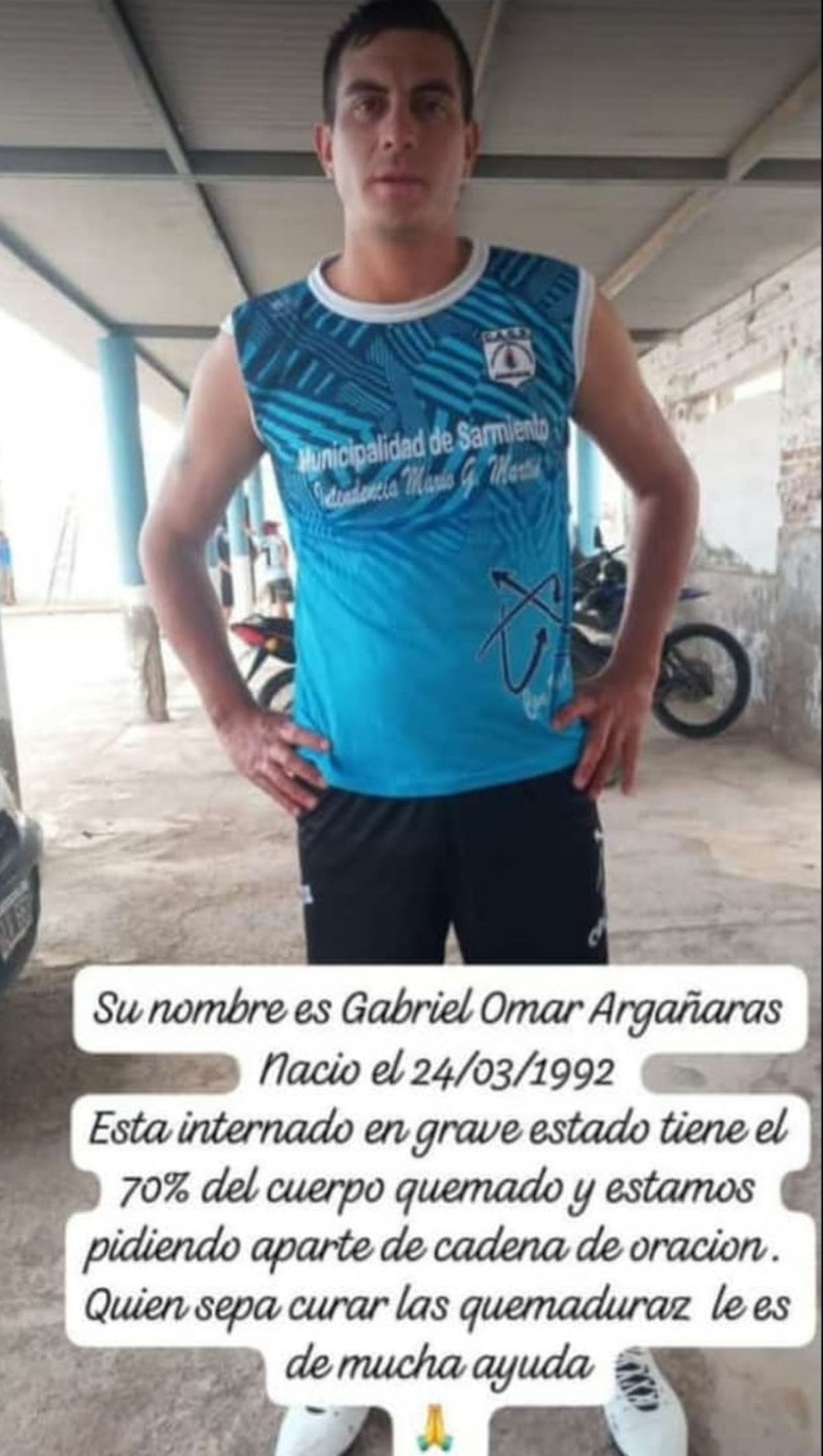 Una vez internado se determinó que tenía el 70% de su cuerpo quemado y desde su entorno lanzaron un pedido de oración por su recuperación, pero, además llamaron a todas las personas que saben curar de palabra las quemaduras para que se sumen a una “curación masiva”.