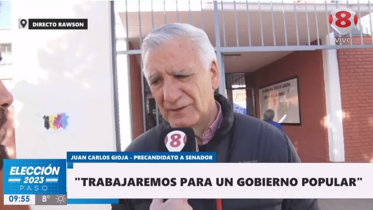 Minutos antes de las 10 de la mañana de este domingo 13 de agosto, Juan Carlos Gioja, precandidato a senador por el espacio San Juan Vuelve llegó hasta la escuela 14 de Febrero ubicada en el departamento de Rawson y habló con Canal 8.