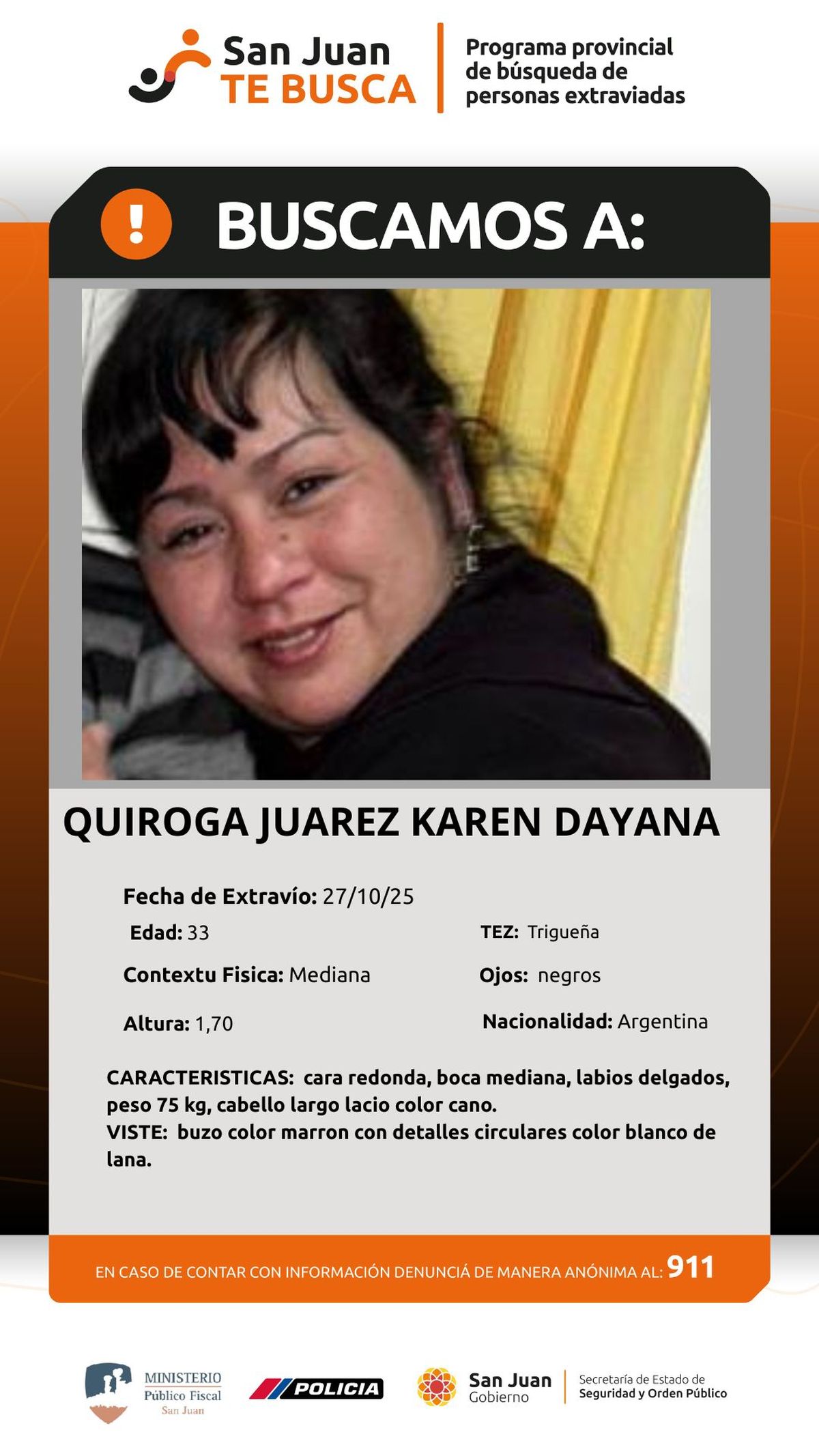 El Programa Provincial de Búsqueda de Personas Extravidas “San Juan Te Busca” emitió un pedido de localización para Karen Dayana Quiroga Juárez, de 33 años, quien se encuentra desaparecida desde el 27 de octubre de 2025.