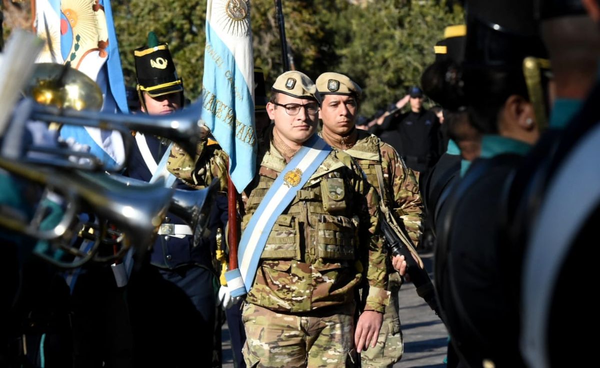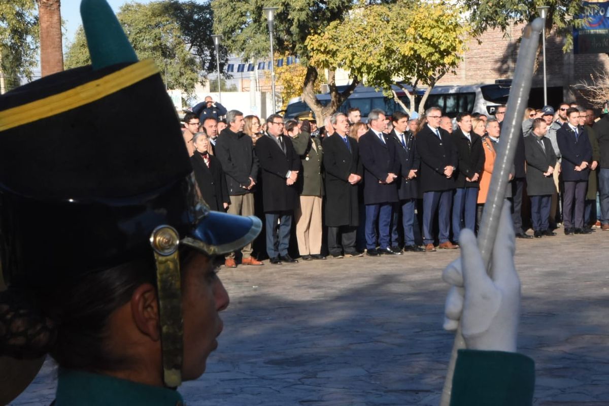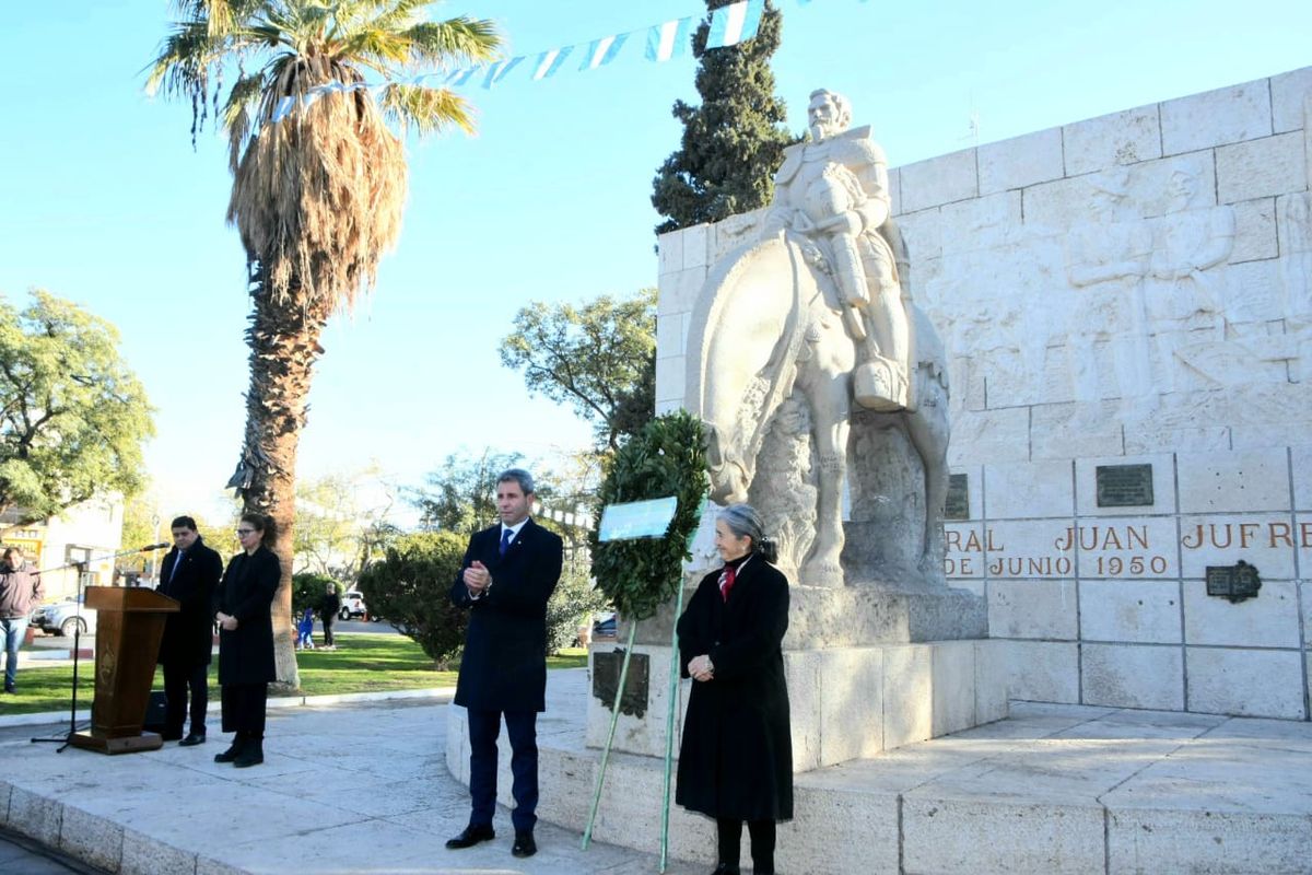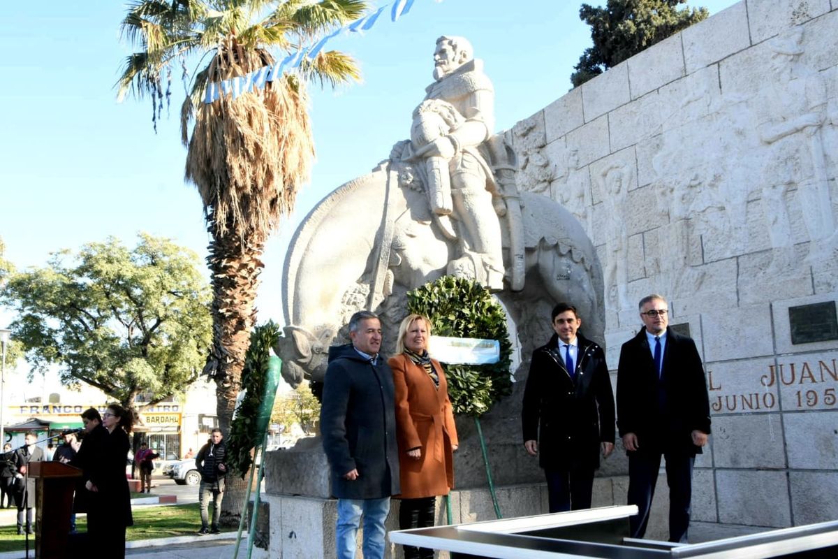 Como es tradición, durante el acto se colocó una ofrenda de laureles en el monumento a Juan Jufré, fundador de San Juan y, acto seguido, entonaron las estrofas del Himno Nacional Argentino, ejecutado por la banda de Música del Regimiento de Infantería de Montaña 22. Luego, el obispo auxiliar, padre Robles pronunció una invocación religiosa.