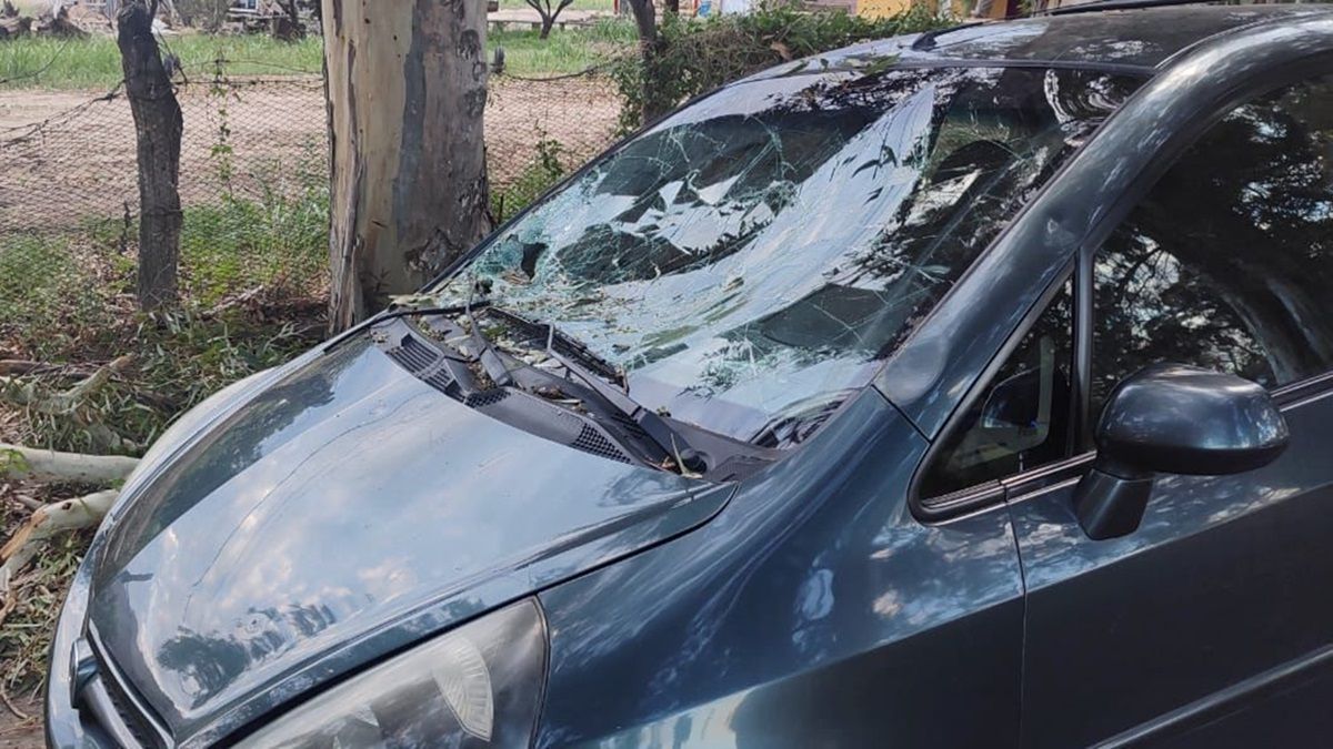 Según fuentes judiciales, un Honda Fit circulaba en dirección oeste-este cuando los ocupantes del vehículo escucharon un fuerte estruendo. Una rama de gran tamaño se había desprendido de un árbol cercano y cayó violentamente sobre el auto, rompiendo el parabrisas.