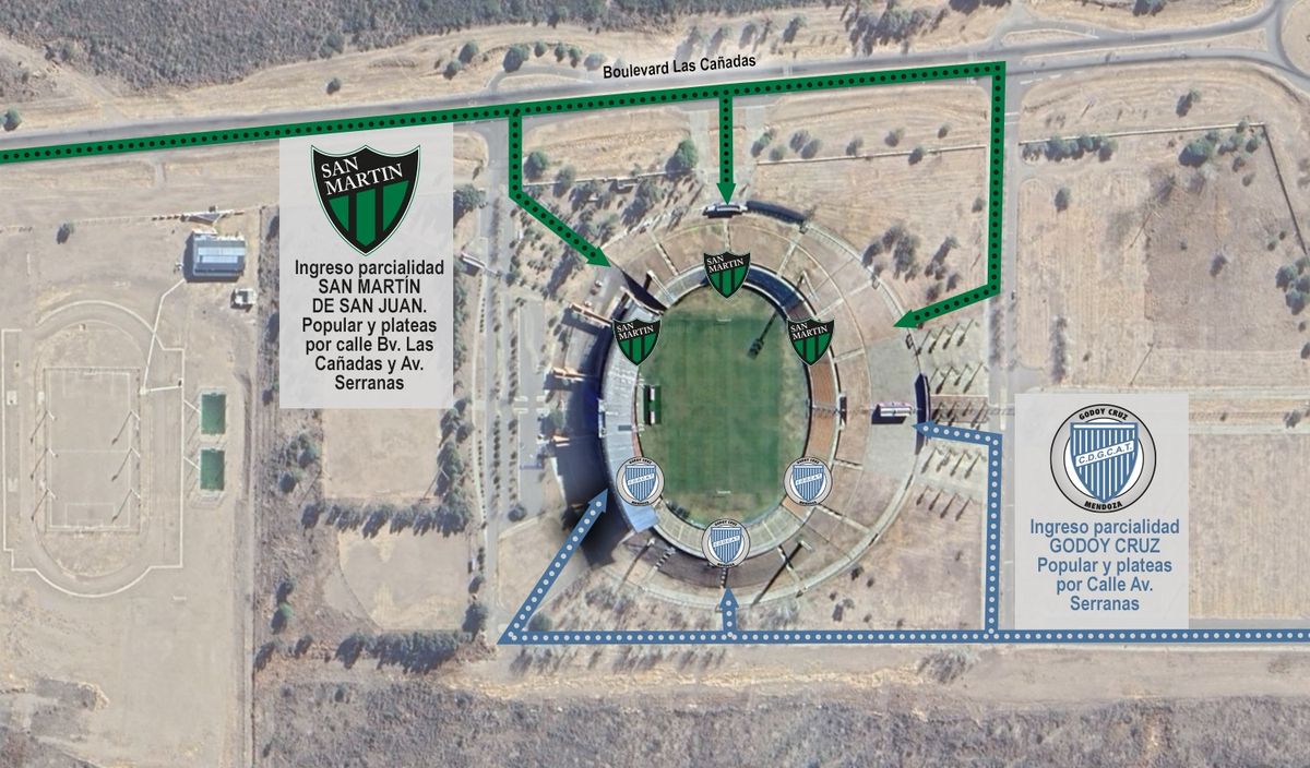 San Martín vs. Godoy Cruz jugarán en San Luis con un fuerte operativo policial. Los hinchas del Verdinegro llegarán por RN 146 e ingresarán por Bv. Las Cañadas.