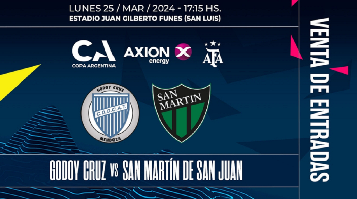 La organización de la Copa Argentina confirmó que este viernes, desde las 12, comenzará la venta de entradas para el partido de Copa Argentina que disputarán San Martín y Godoy Cruz en San Luis. El expendio se realizará a través de la web deportick. El partido se jugará el lunes 25 de marzo a las 17.15 en el estadio Juan Gilberto Funes de La Punta.