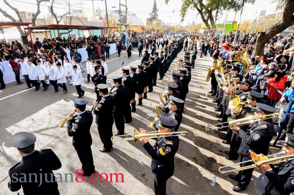 El gobernador Sergio Uñac encabezó el desfile por los 454 años de la Fundación de la Ciudad de San Juan. En un enérgica bienvenida, el primer mandatario provincial saludó a los miembros de fuerzas de seguridad que entonaron el Himno Nacional Argentino.