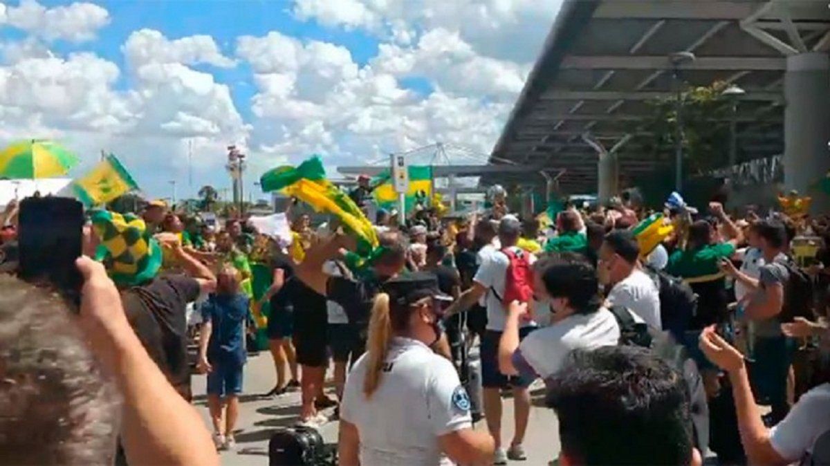 Una multitud recibió este mediodía al plantel de Defensa y Justicia, flamante campeón de la Copa Sudamericana, a la salida del hall principal del Aeropuerto Internacional de Ezeiza.