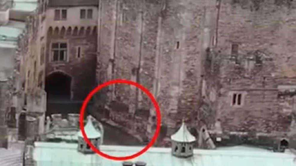 El momento sobrenatural fue captado por un drone que sobrevolaba el castillo de Berkeley, ubicado en el condado de Gloucestershire. Como se ve en las imágenes, por escasos segundos asoma una extraña forma que muchos aseguran que es el fantasma del jinete sin cabeza.