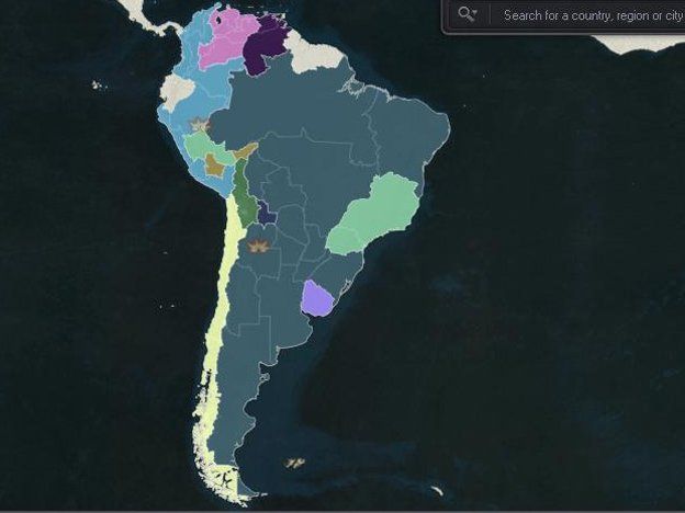 Argentina: ¡El país mais grande do mundo! El mapa no deja mentir, nuestro país se extiende por miles de kilómetros a lo largo de Sudamérica y su frontera limita con Colombia y Venezuela. Así es en la realidad virtrual de [%(link0)]eRepublik, juego de guerra y estrategia on line que miles de personas en 70 países disputan en tiempo real desde sus computadoras.